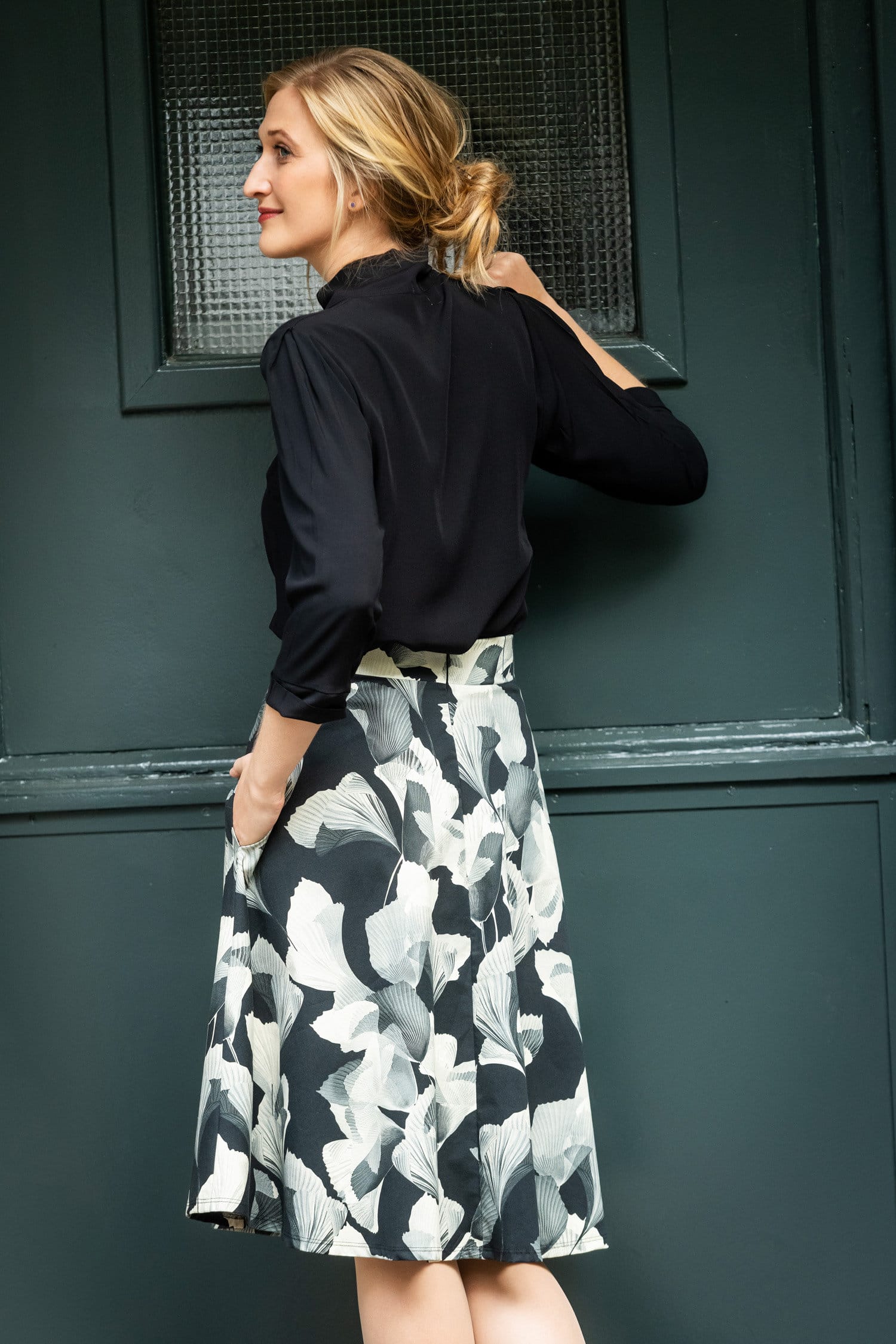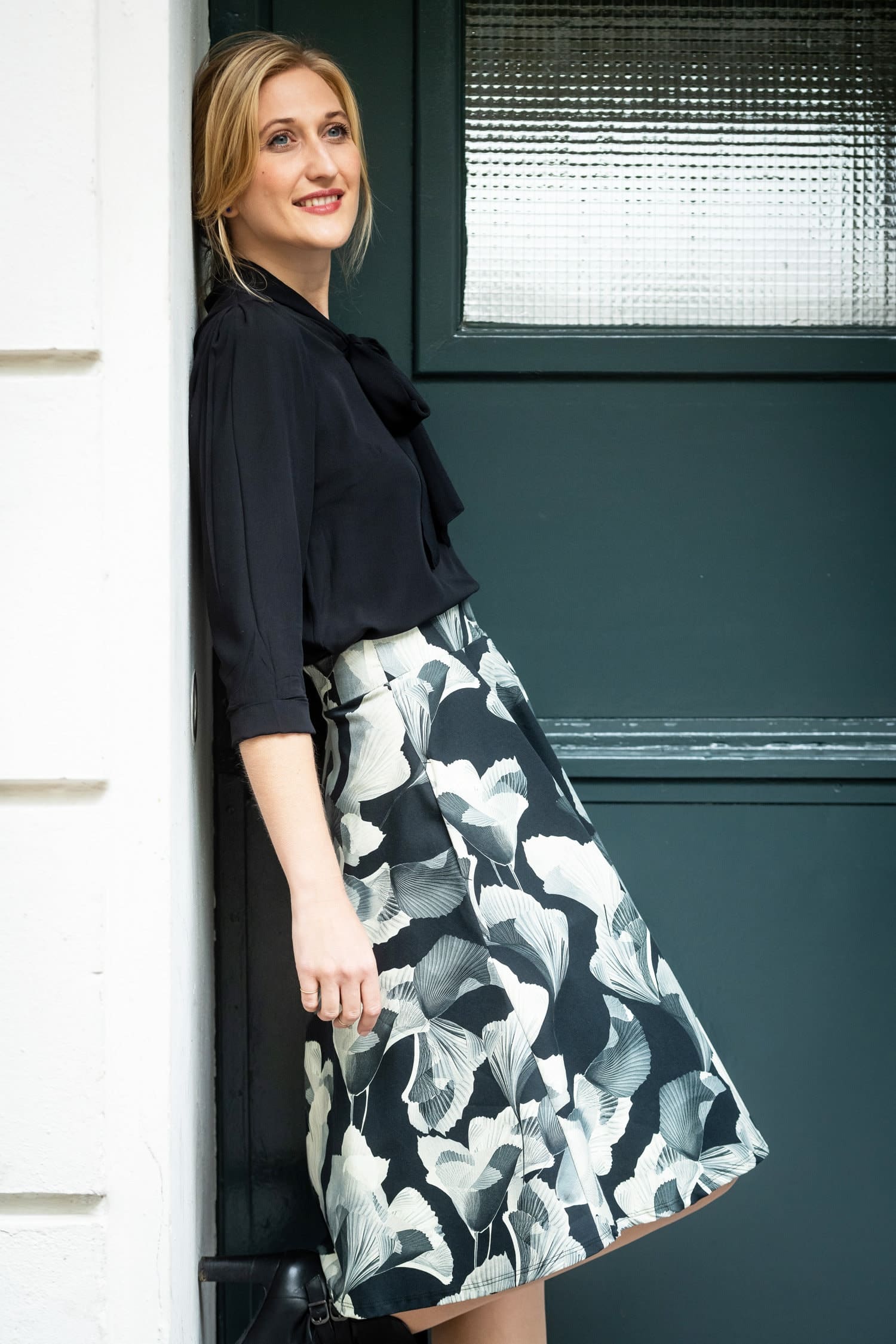 Valerie ist ein schwingender Rock mit vier Falten im Vorderteil. Er hat eine klassische Länge und reicht etwas unter das Knie.
