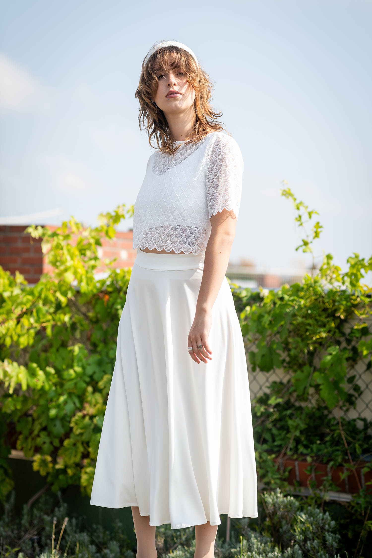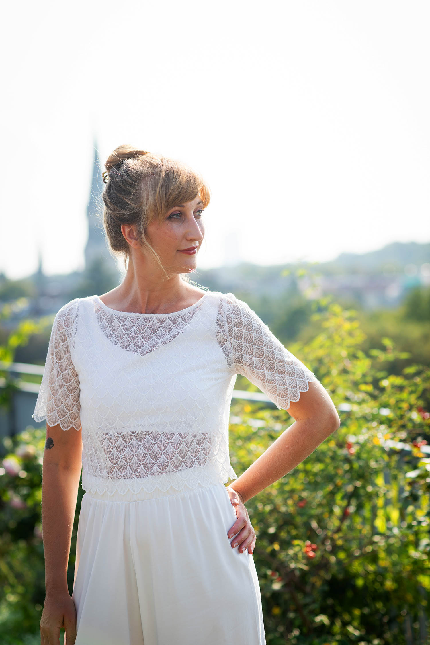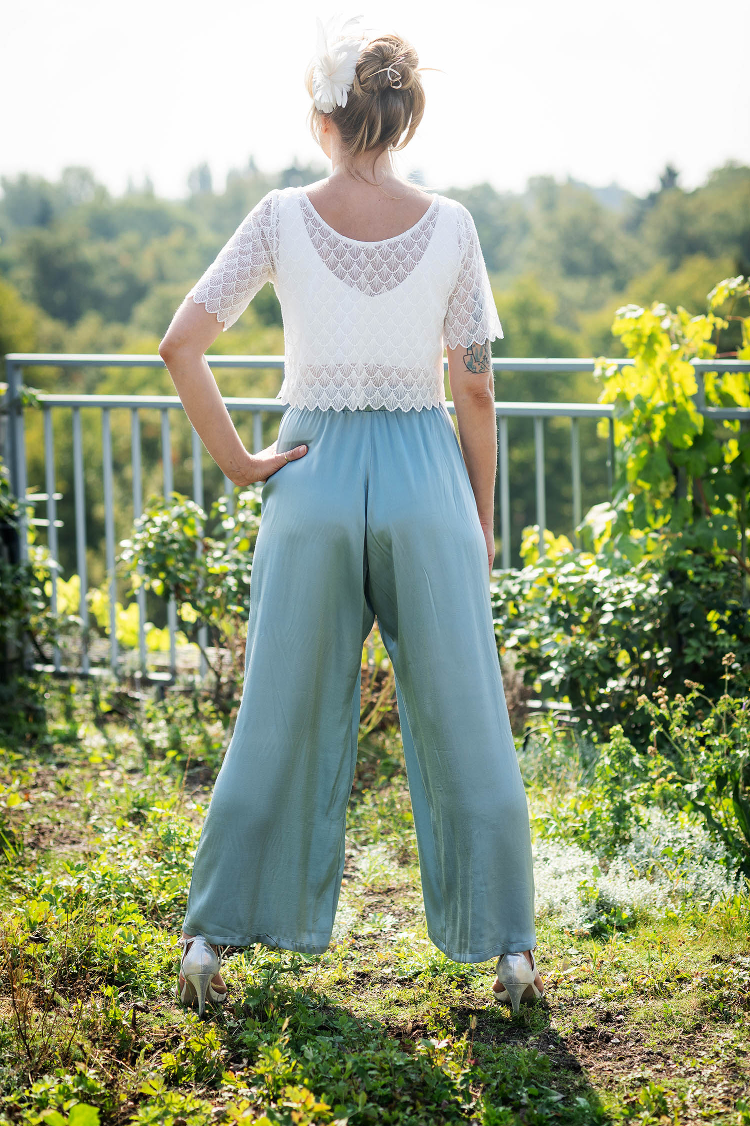 Das Top eignet sich ganz wunderbar für ein mehrteiliges Brautkleid. Es passt zu jedem unserer Brautröcke, lässt sich aber auch sehr stylisch zu unseren hochgeschnittenen Brauthosen Verona oder Siena tragen.