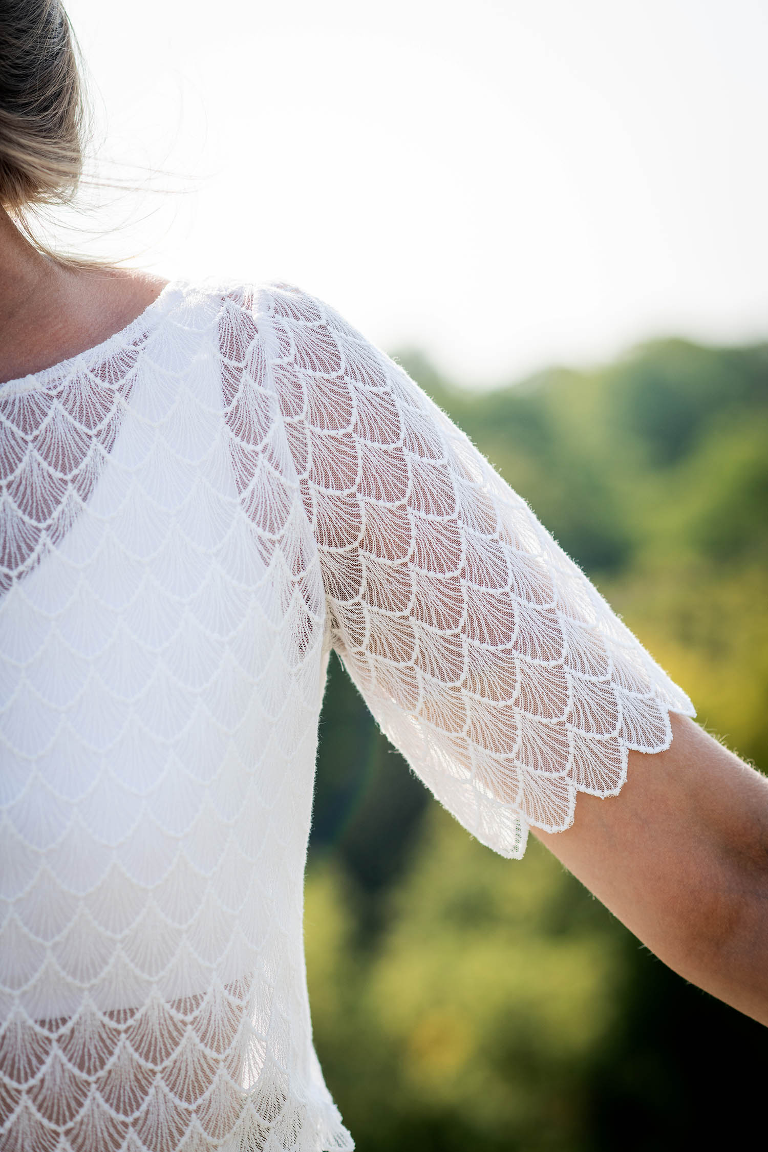 Aurora bezaubert mit einem Ausschnitt, der den Rücken wunderschön zur Geltung bringt. Die halblangen Ärmel enden über dem Ellbogen, die zarte Bogenkante zieht die Blicke auf dich.