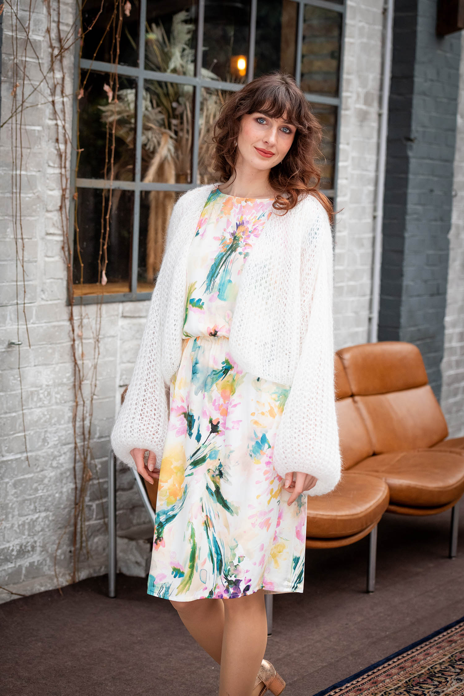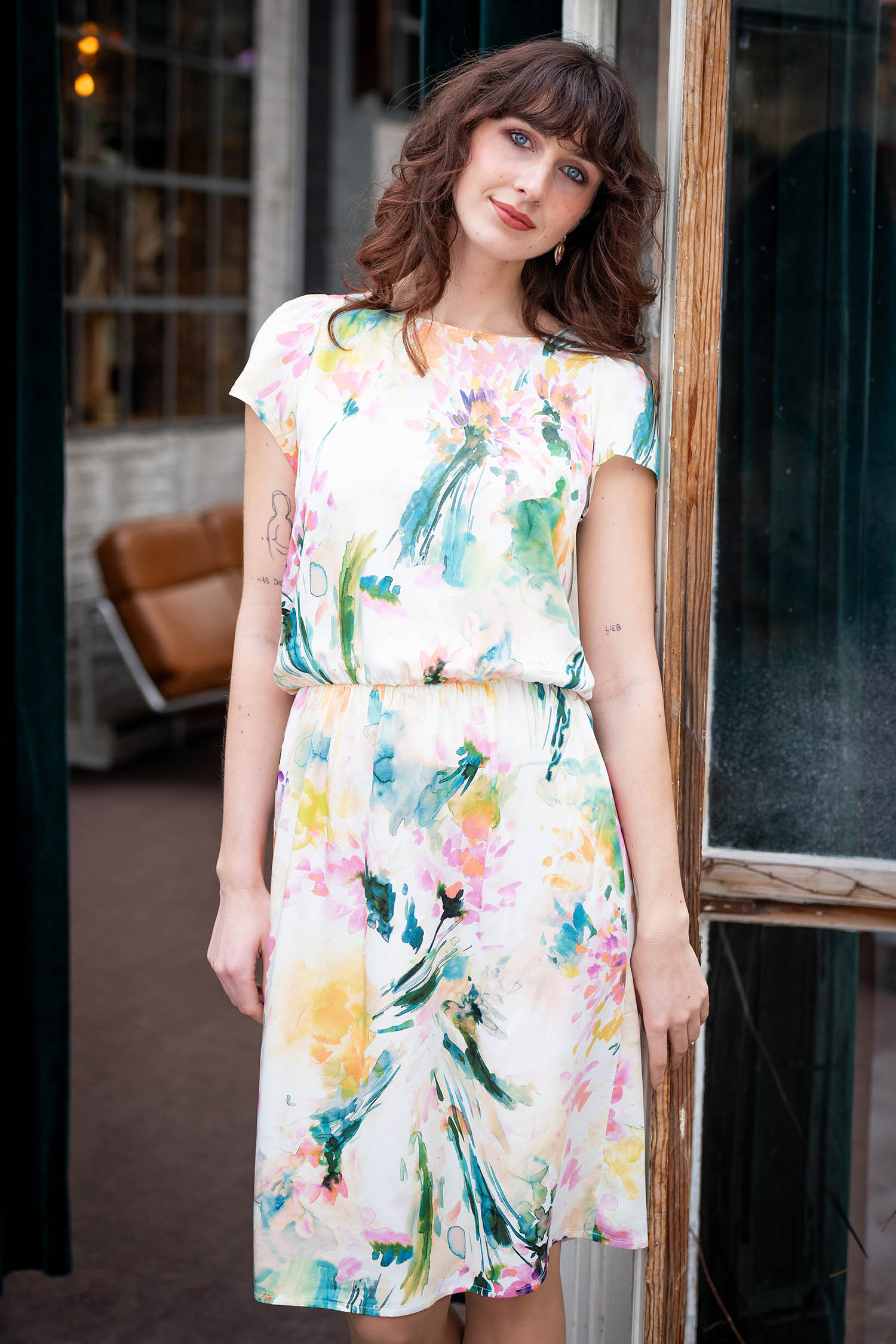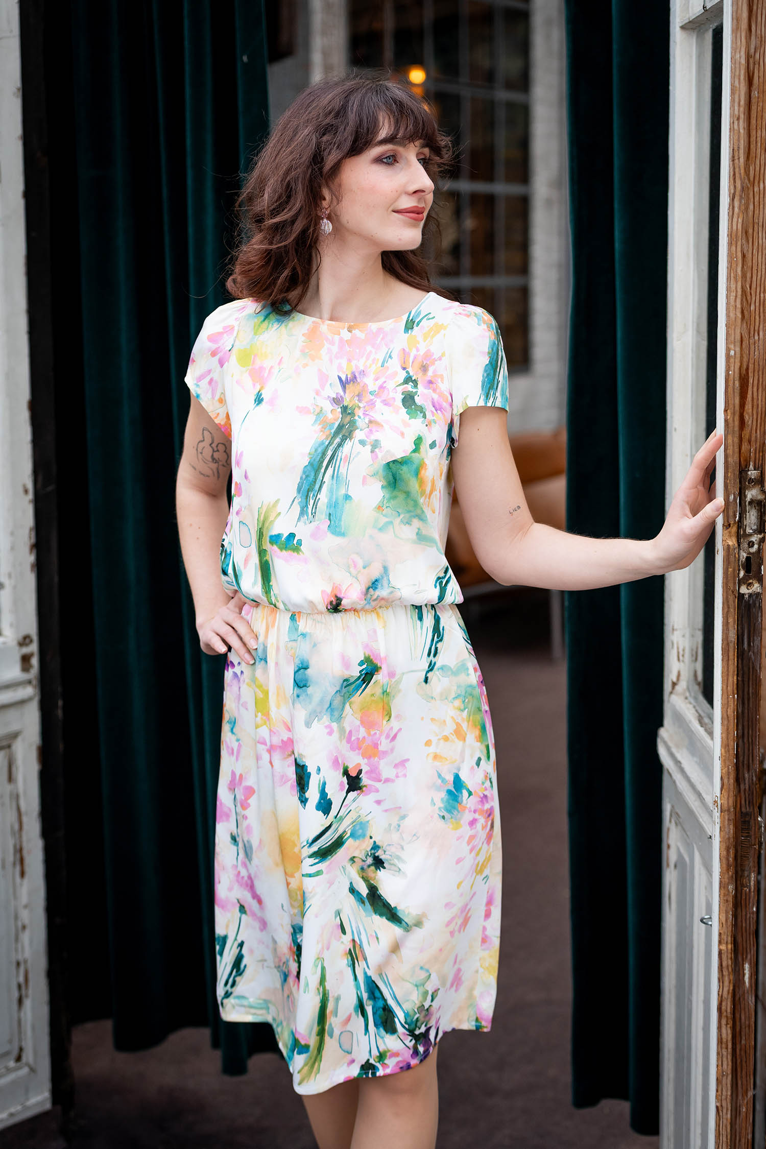 Der Pastell Garden Print besticht durch zarte, harmonische Farben in sanften Pastelltönen wie Rosé, Creme, Hellgrün und Pfirsich. Das romantische, florale Muster macht Lara besonders feminin und stilvoll – ein Kleid, das sowohl im Alltag als auch zu besonderen Anlässen, wie Standesamt oder Sommerhochzeiten, für Aufmerksamkeit sorgt.