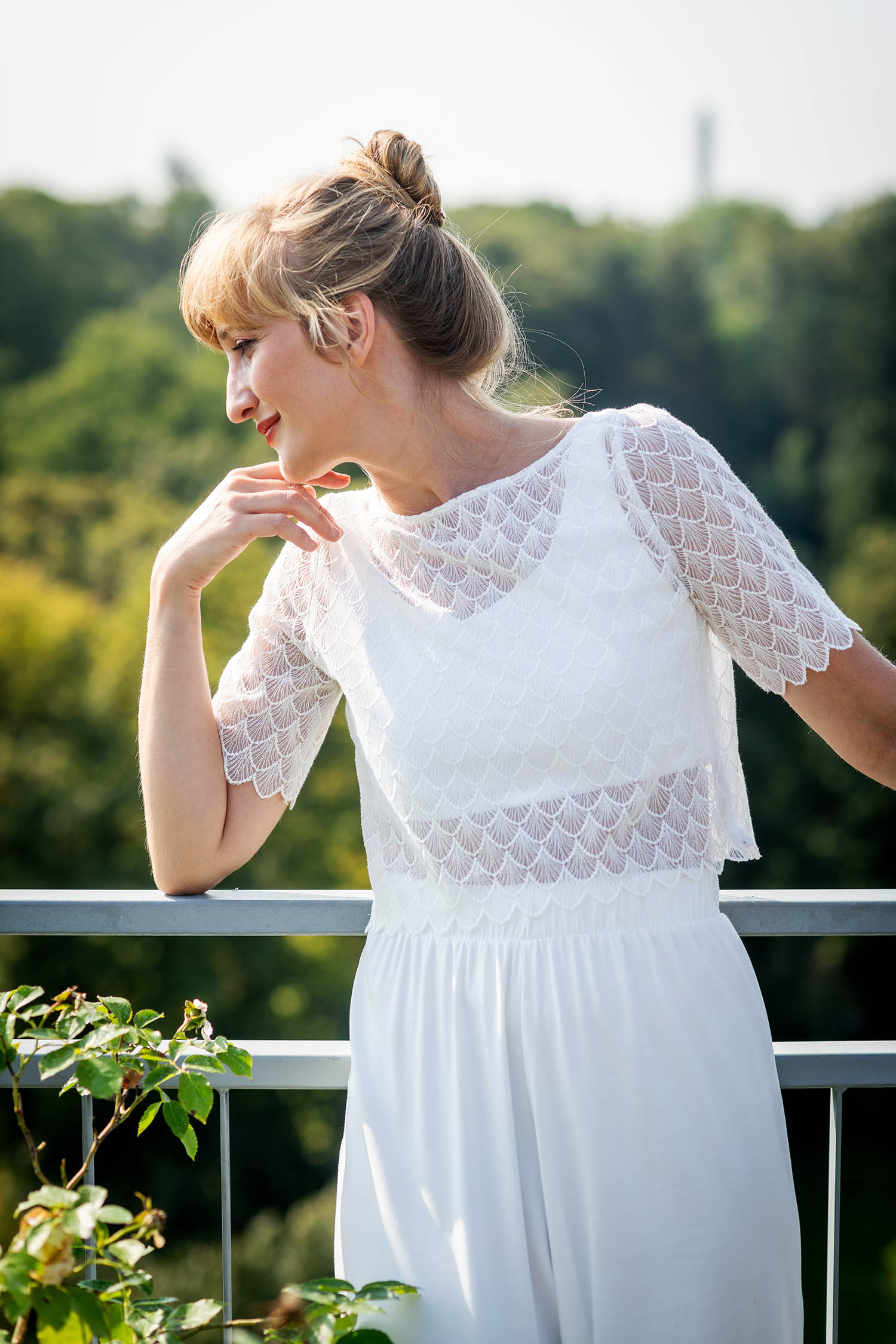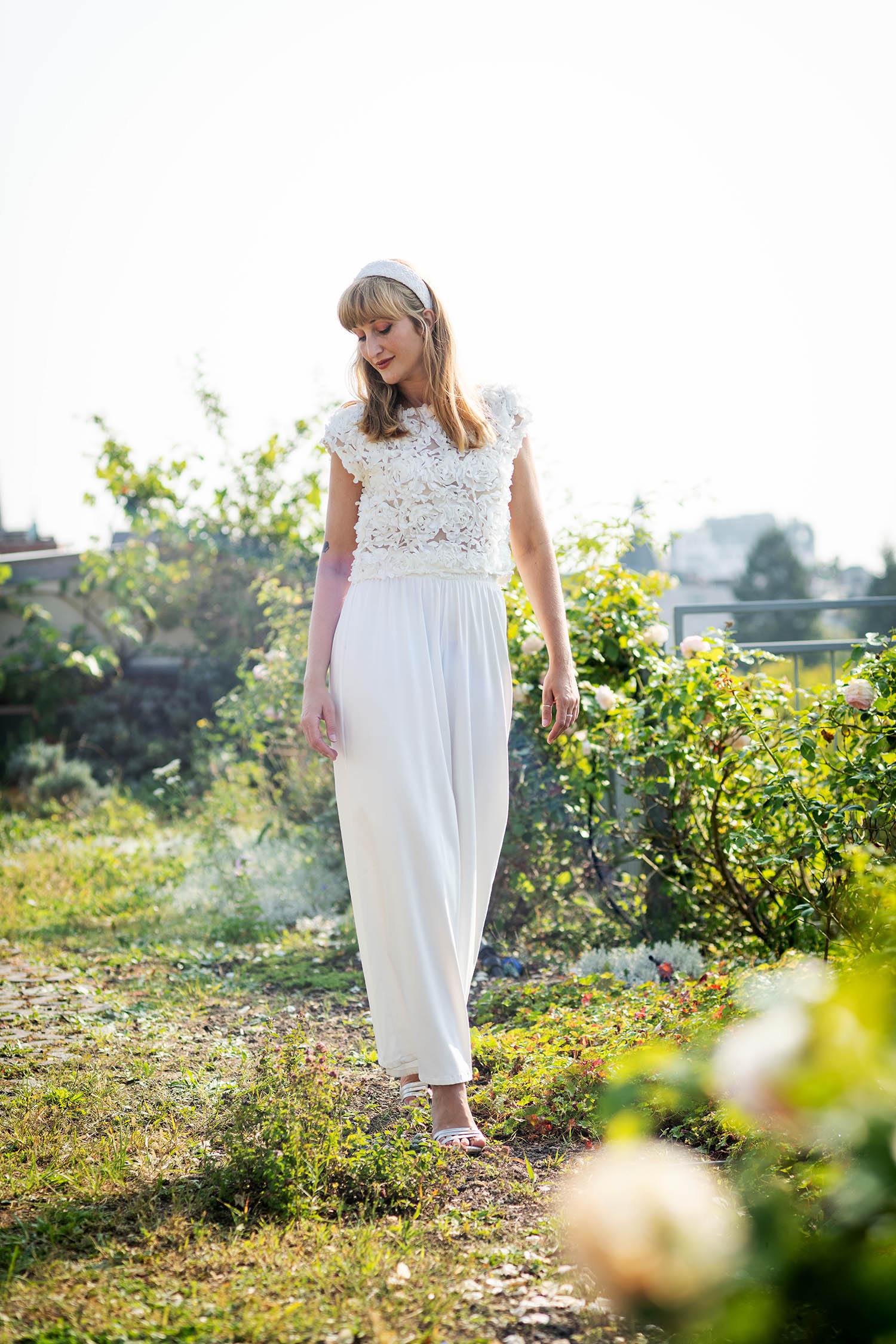 Die Hose lässt sich wunderbar mit allen unseren Brauttops kombinieren und ist als Zweiteiler eine tolle Alternative zu einem klassischen Brautkleid. So könnt ihr beides auch nach der Hochzeit weiter tragen.