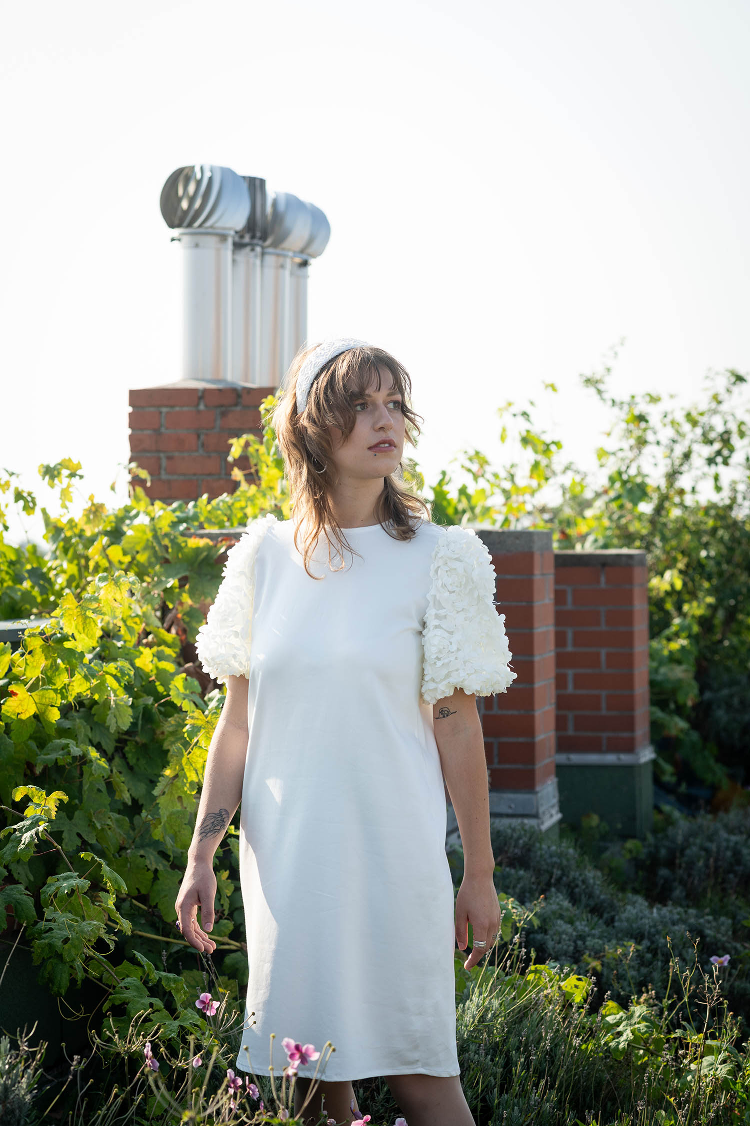 Leicht, modern und voller Charme: Chloé ist ein lässiges, locker geschnittenes Brautkleid in eleganter A -Linie. Es besticht durch aufwändig gearbeitete Puffärmel, die mit cremeweisses Blüten besetzt sind. Der restliche Schnitt bleibt bewusst schlicht, sodass die extravaganten Ärmel im Mittelpunkt stehen.