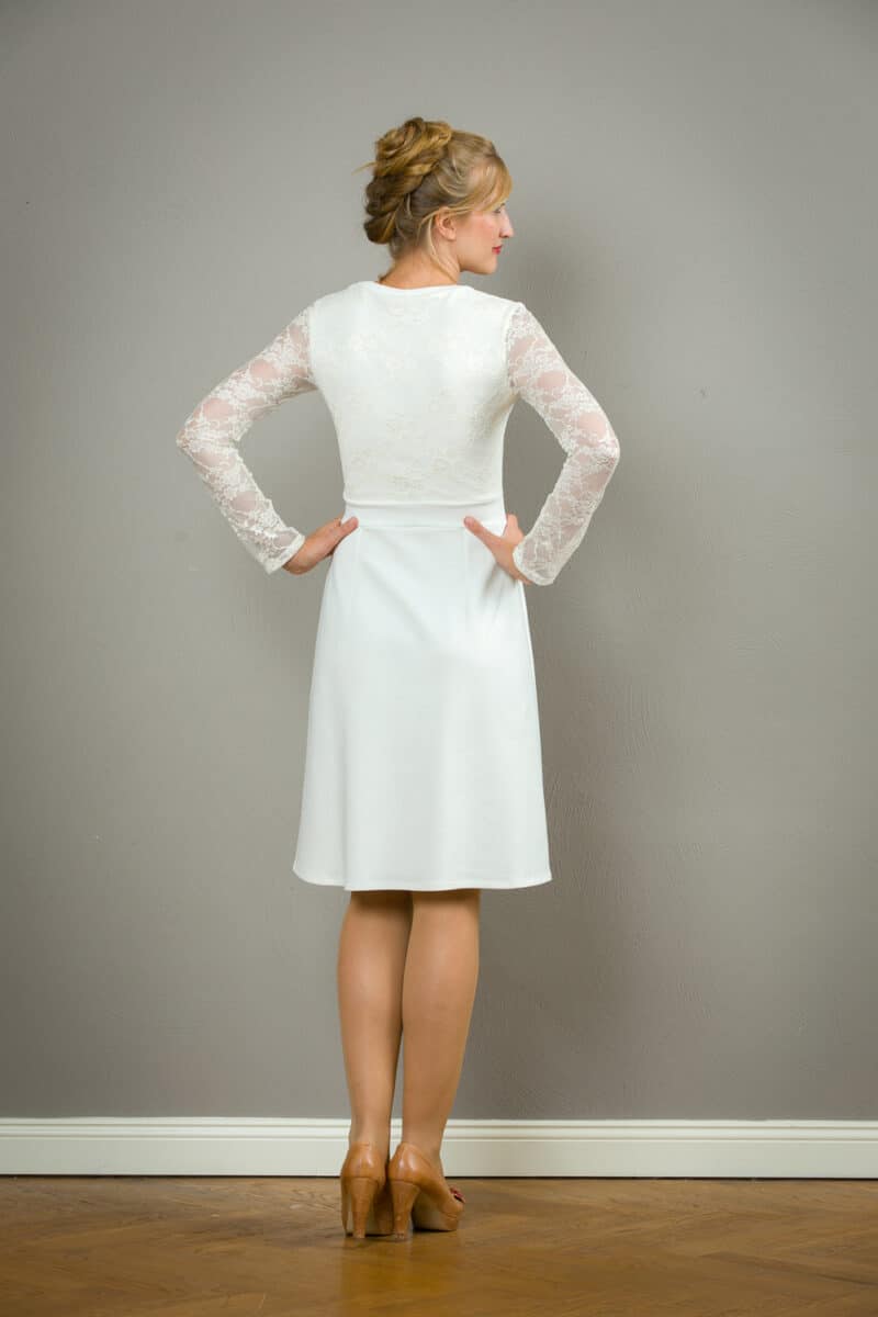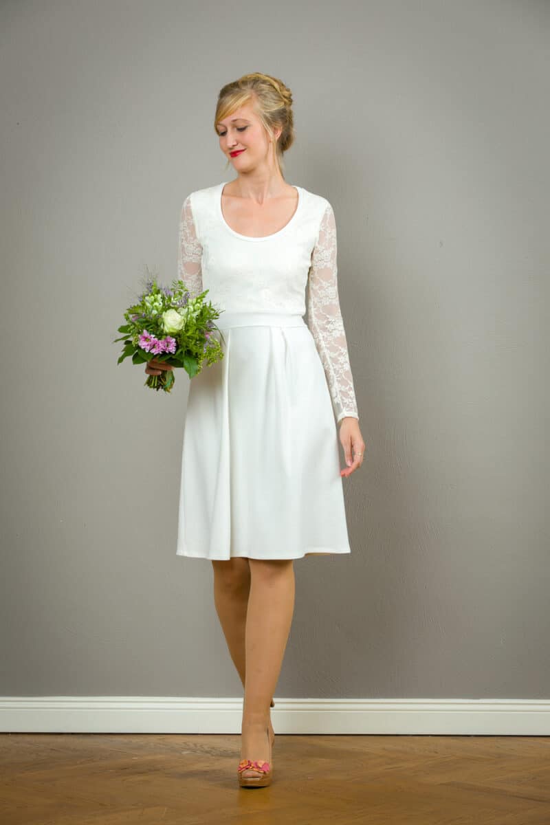 Ein cremeweisses Hochzeits-Kleid aus edlem Romanitjersey und langen schmalen Ärmeln aus feiner Berliner Spitze. Besonders schön und schmeichelhaft ist der schlichte runde Ausschnitt.