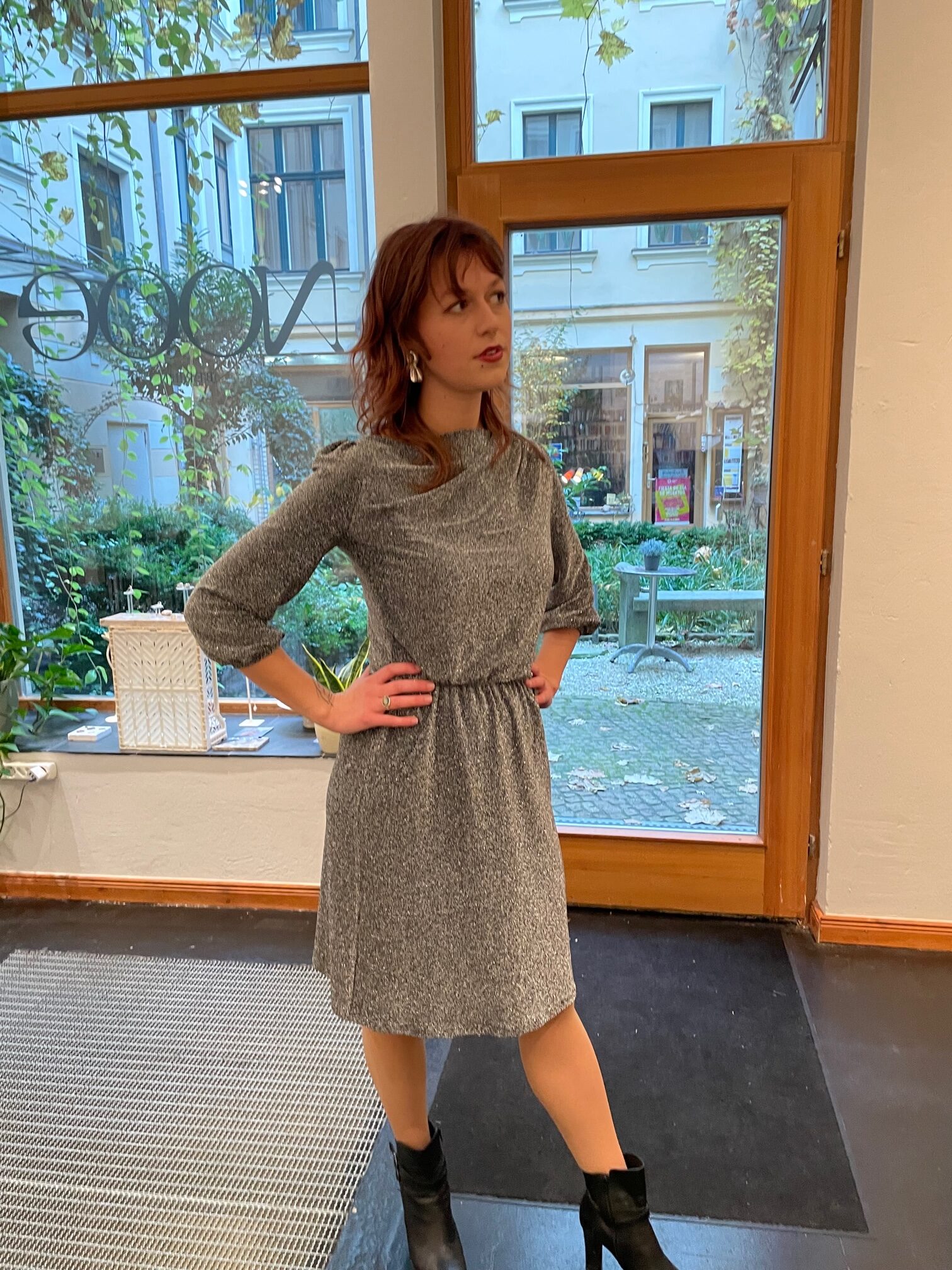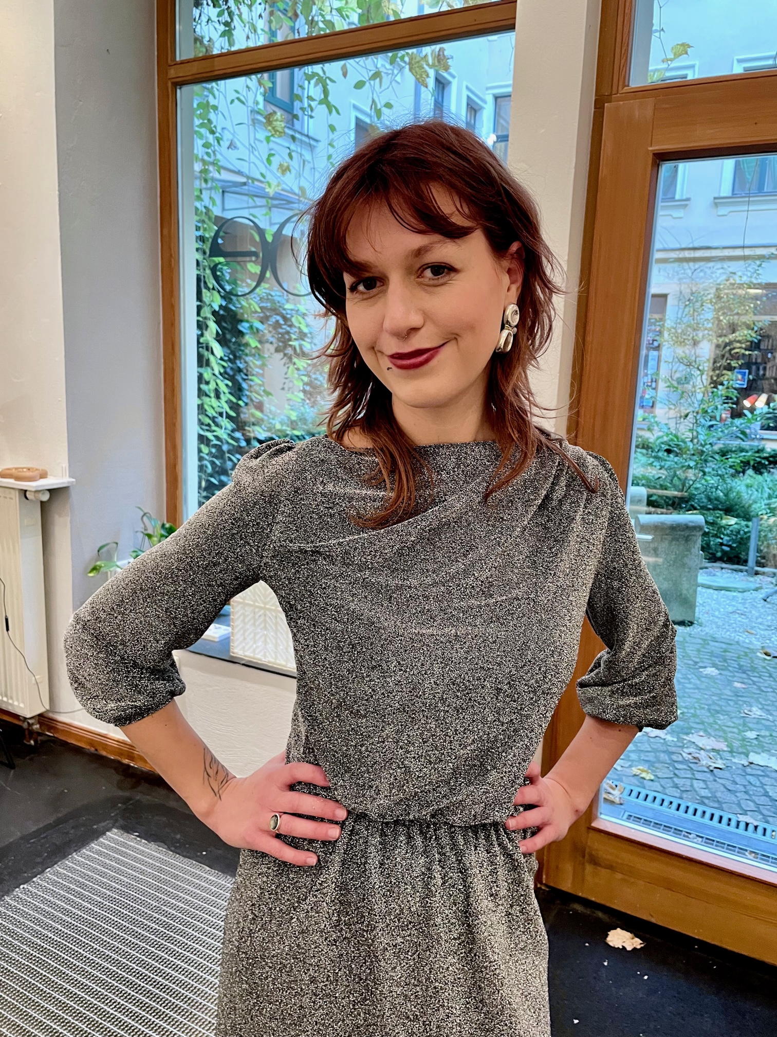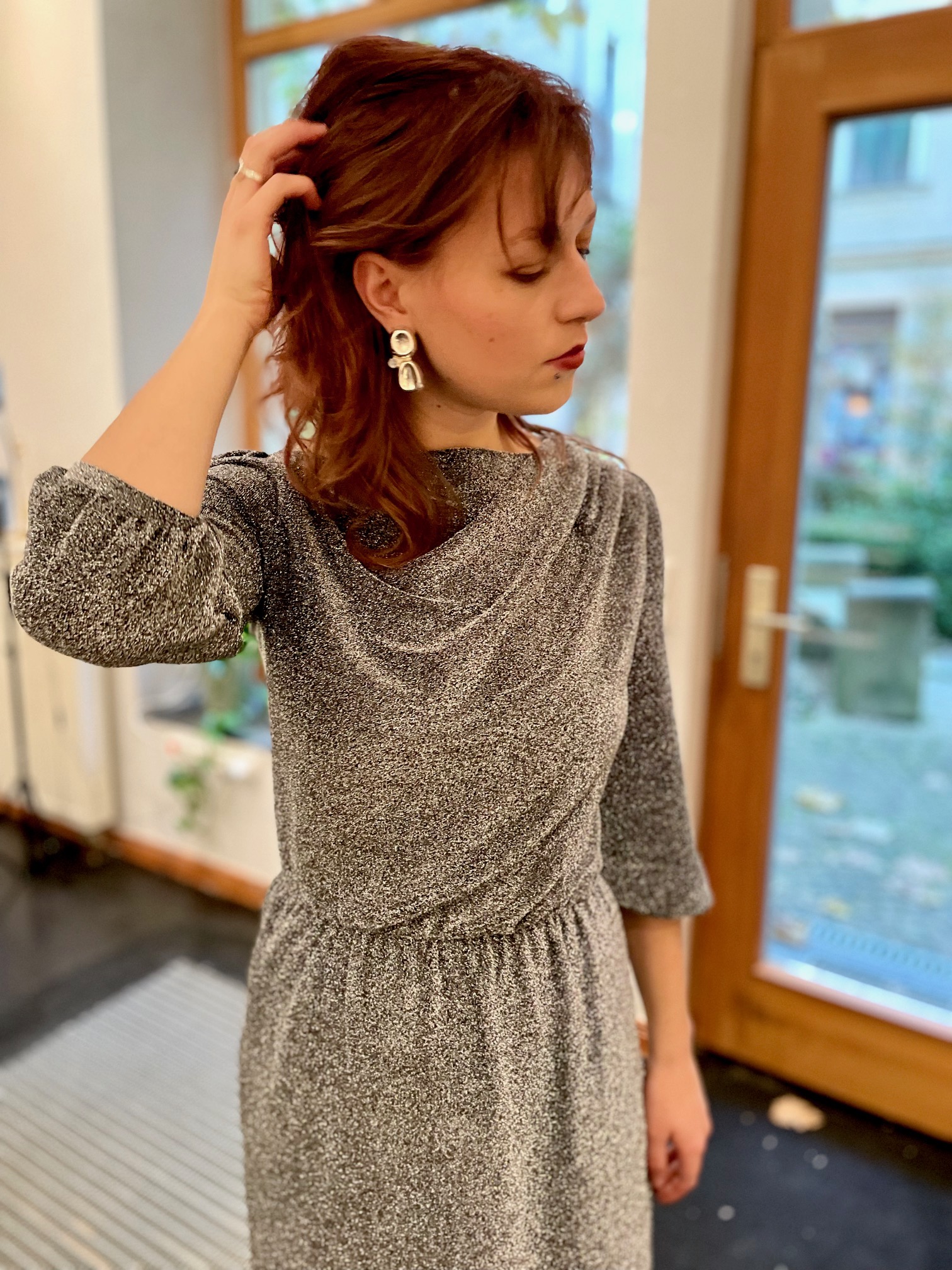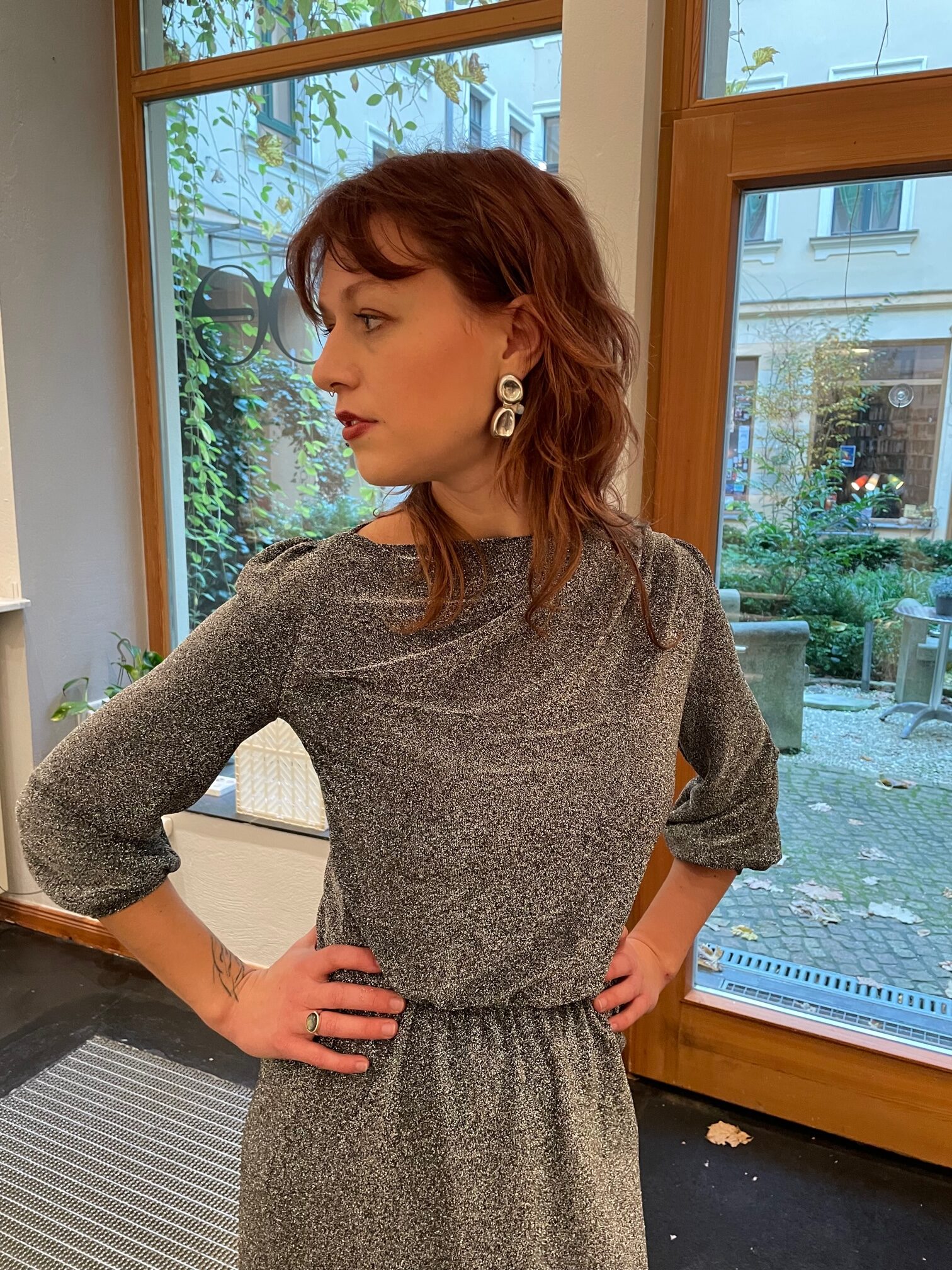 Setze funkelnde Akzente mit unserem Kleid Pheline aus silber schimmerndem Lurex-Stoff. An der rechten Schulter sind vier kleine Fältchen abgelegt, deren Weite in einen leicht asymmetrischen Wasserfallausschnitt übergeht. Der asymmetrische Ausschnitt verleiht dem Kleid einen modernen, spannenden Look. Die glänzende Textur des Stoffes sorgt für einen Hauch von Glamour.