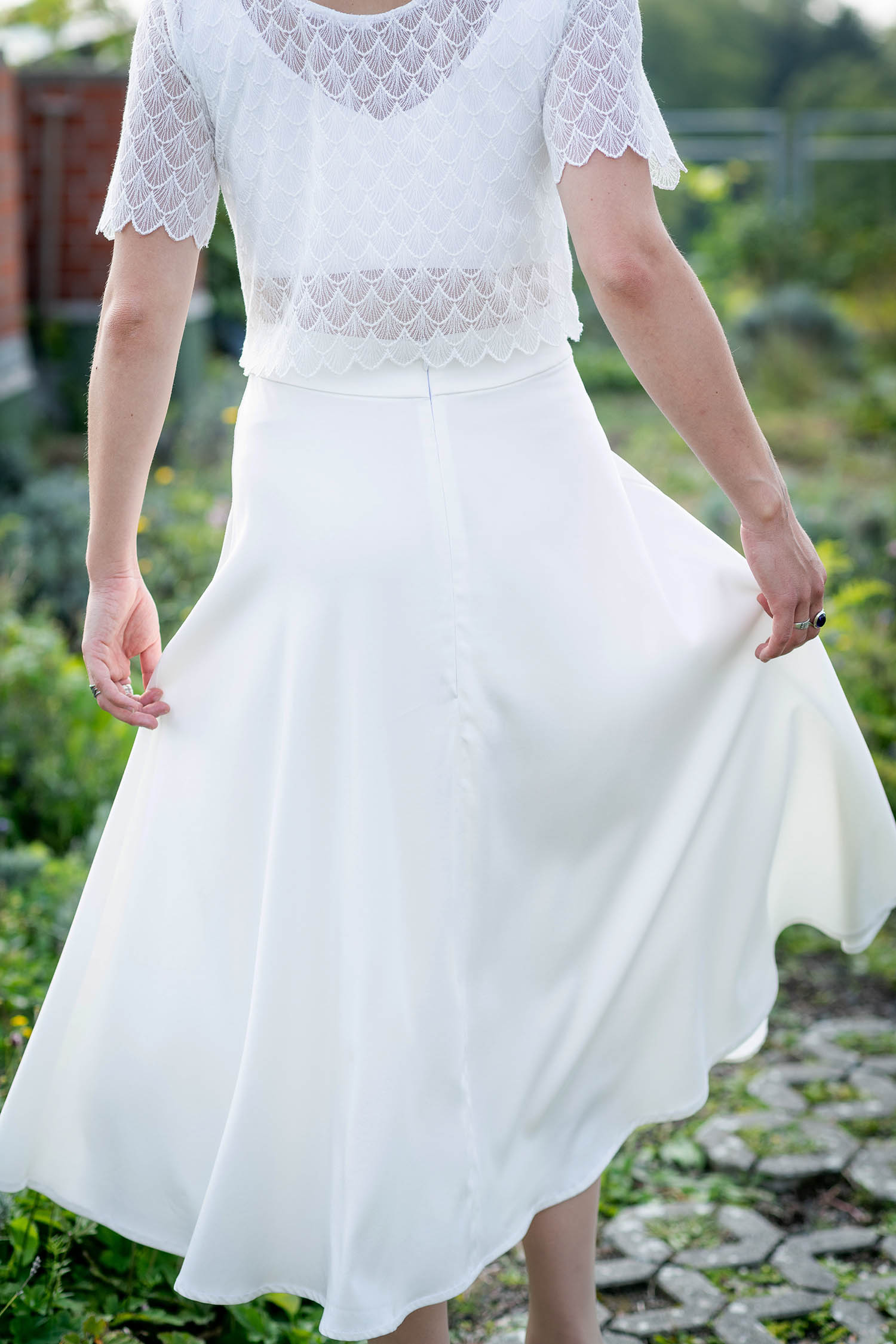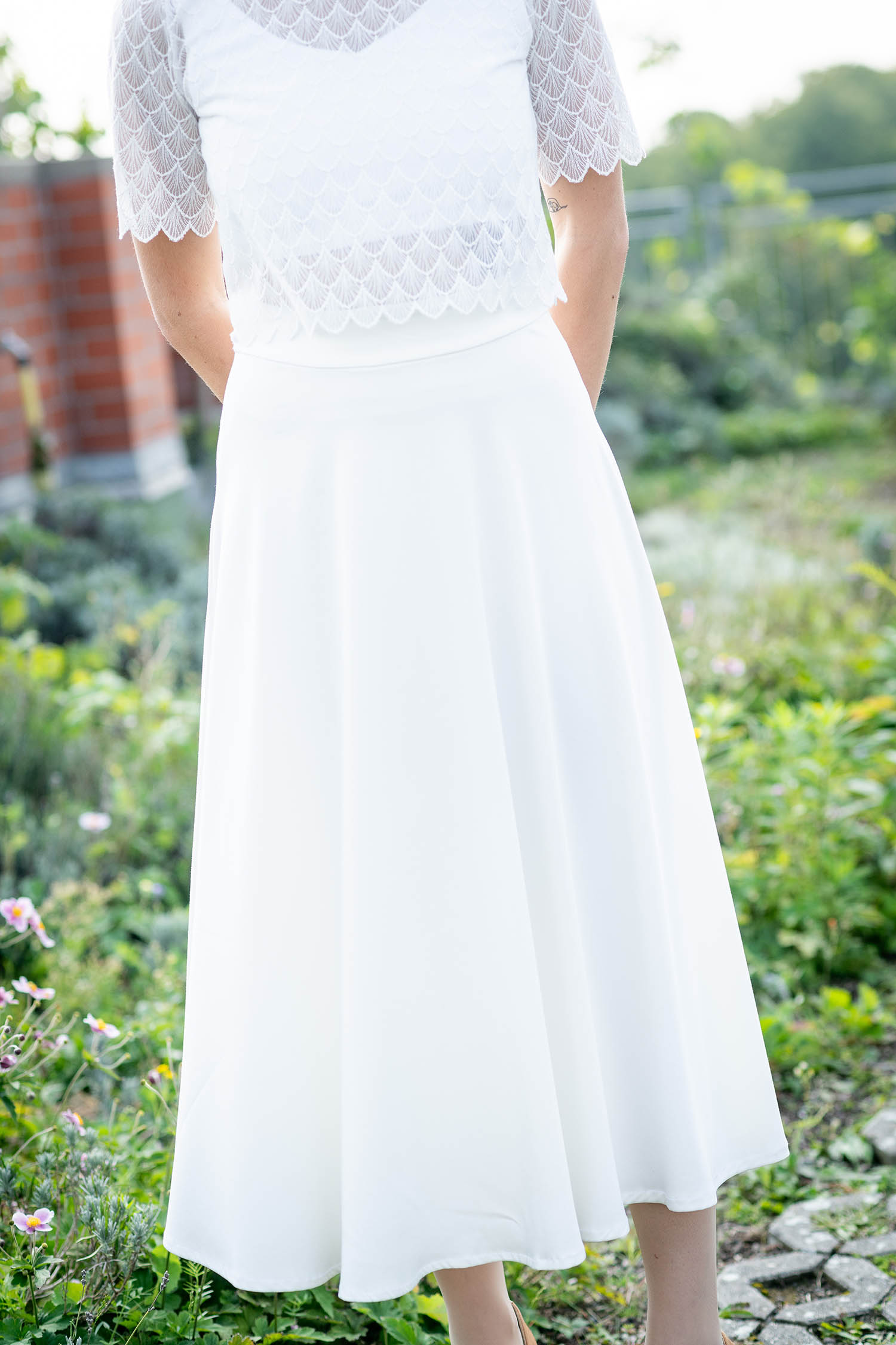 Unser Midi Brautrock JOY ist weit geschnitten, wunderbar schwungvoll und sehr feminin. Er ist cremeweiss sitzt direkt in der Taille und wird am Rückteil mit einem Reißverschluss geschlossen. Der Stoff hat einen wunderschöne Haptik. Der Rock ist ungefüttert für einen leichten, sommerlichen Fall.