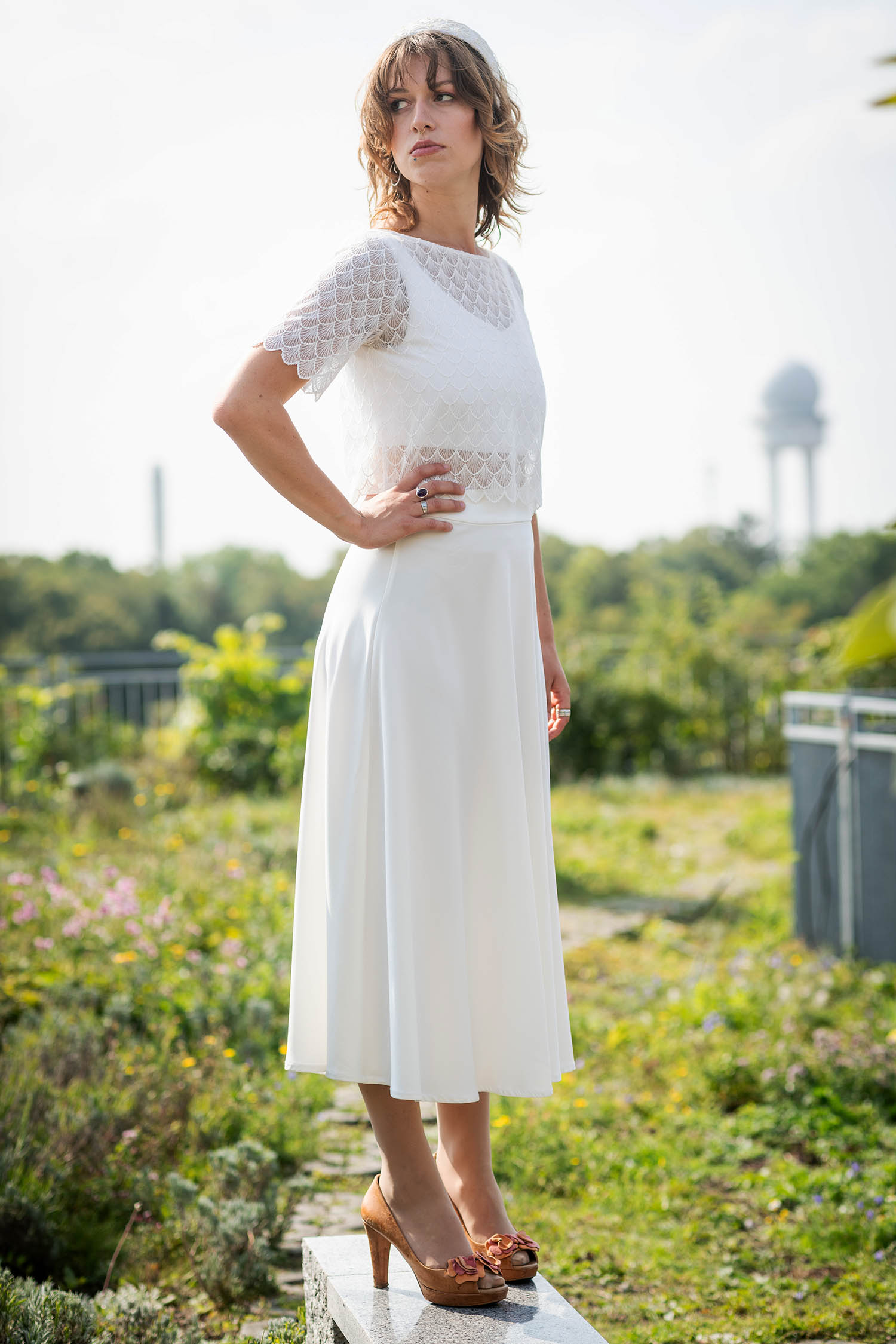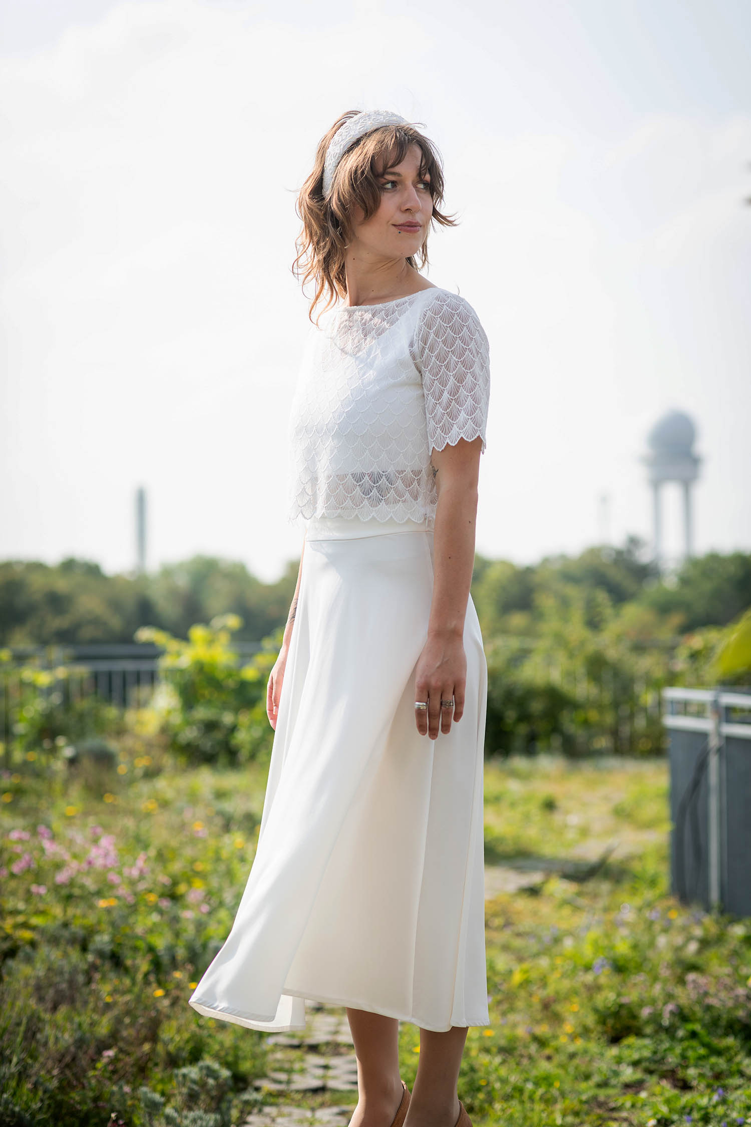 Joy lässt sich wunderbar mit allen unseren Brauttops kombinieren und ist als Zweiteiler eine tolle Alternative zu einem klassischen Brautkleid. So könnt ihr beides auch nach der Hochzeit weiter tragen.