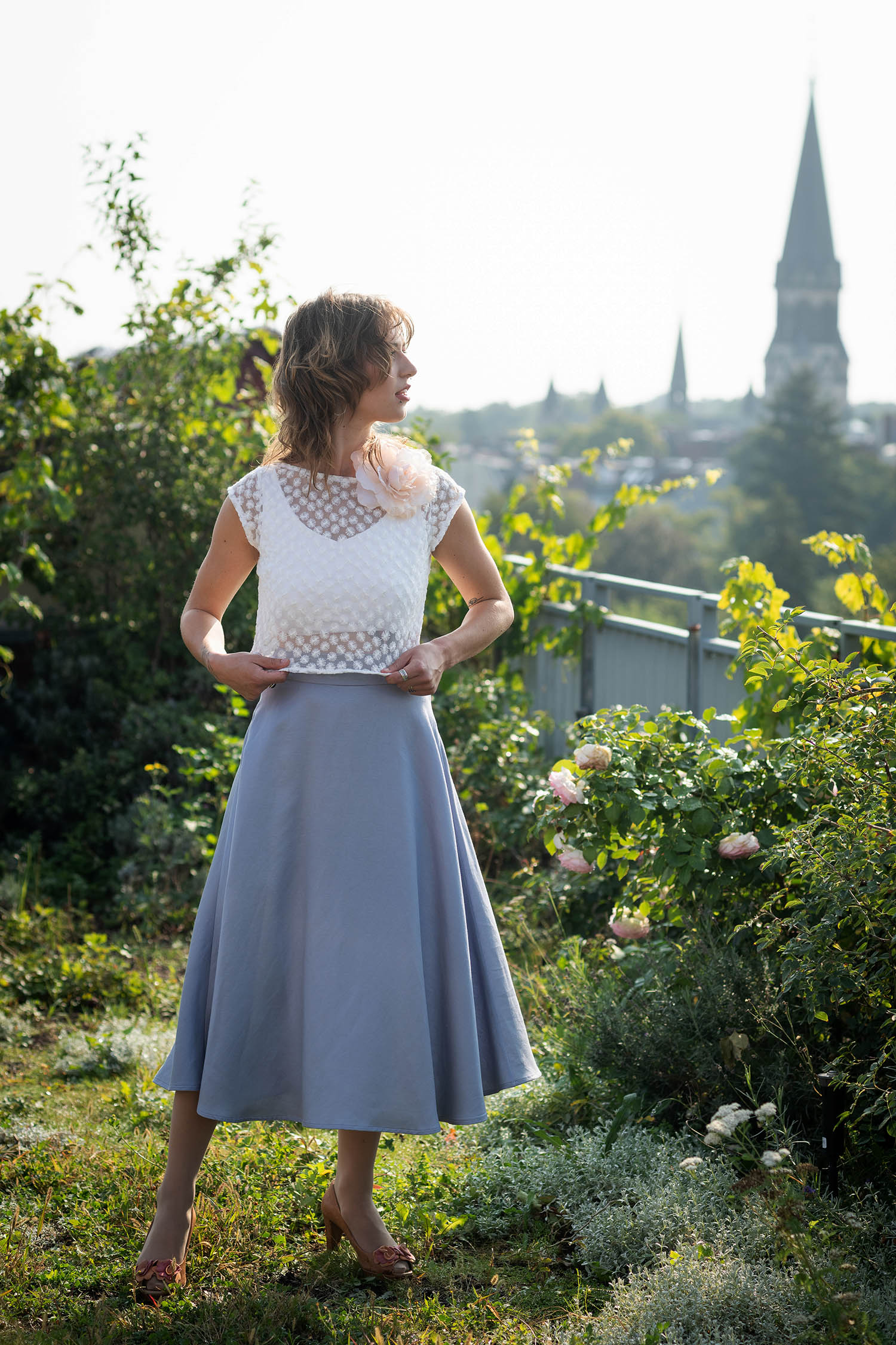 Auf dem Foto ist JOY zu unserem Brauttop Rosie kombiniert. Ein wunderbar leichtes Top mit feinen Pusteblumenornamenten.